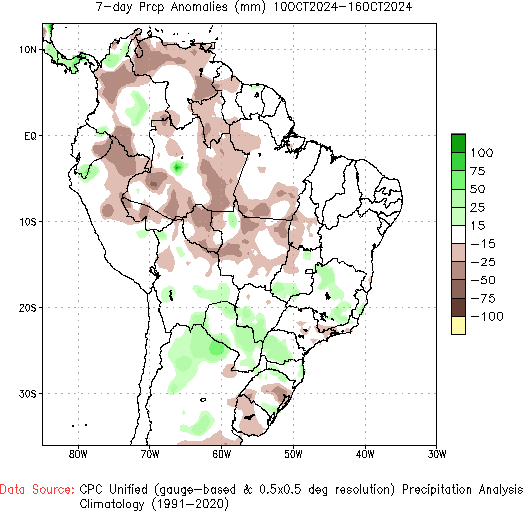 10月18日当周,巴西玉米主产区气温距平值偏高,中南部地区降水与往年相比偏多,南里奥格兰德州降水偏少;NOAA预计,巴西玉米主产州未来6-10日气温依旧偏高,巴西南里奥格兰德州降水偏多,巴西中南部玉米主产州马托格罗索州、帕拉纳州降水偏多。