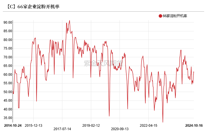 截止10月18日当周,66家企业淀粉开机率为61.2%,较上周降低0.51%。