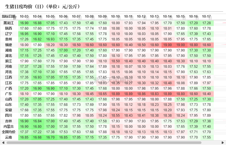 截止10月18日当周,全国生猪出栏均价在全国生猪出栏均价为17.94元/公斤,较上周价格上涨0.30元/公斤,环比上涨1.70%,同比上涨 16.49%。养殖利润方面,自繁自养养殖利润为346.01元/头,外购仔猪利润27.79元/头,养殖利润小幅回落。