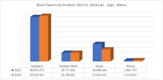 截止当周,巴西玉米2024年1-9月累计出口2349.2万吨,相比去年1-9月出口3408.4万吨,减少1059.2万吨,降幅31.07%。